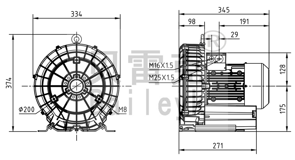 最大風(fēng)量:210m3/h 最大正壓:270mbar 最大負(fù)壓:220mbar 防護(hù)等級:IP55 噪音:64db 重量:26Kg